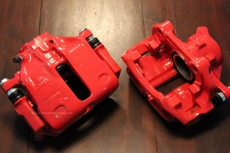 Die Bremssättel werden in einem 2 Schichtverfahren pulverbeschichtet. Hier wird nach dem entfernen vom Rost und Farbrückständen, sowie dem reinigen zuallererst ein Grunddierungspulver aufgetragen und eingebrannt. Anschließend wird dann die gewünschte RAL-Farbe aufgetragen und ebenfalls eingebrannt. Dieses sogenannte 2 Schichtverfahren erhöht die Korrosionsbeständigkeit der Bremssättel. Ein weiterer positiver Nebeneffekt ist das die Oberfläche glatter wird.