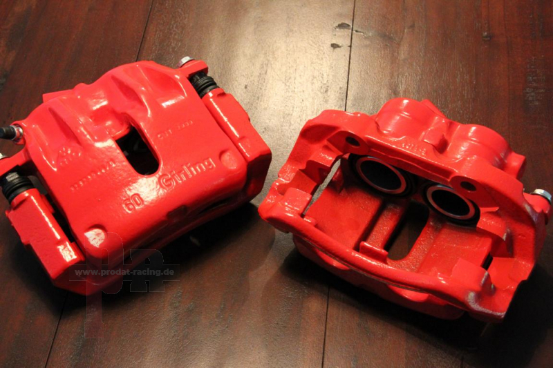 Die Bremssättel werden in einem 2 Schichtverfahren pulverbeschichtet. Hier wird nach dem entfernen vom Rost und Farbrückständen, sowie dem reinigen zuallererst ein Grunddierungspulver aufgetragen und eingebrannt. Anschließend wird dann die gewünschte RAL-Farbe aufgetragen und ebenfalls eingebrannt. Dieses sogenannte 2 Schichtverfahren erhöht die Korrosionsbeständigkeit der Bremssättel. Ein weiterer positiver Nebeneffekt ist das die Oberfläche glatter wird.
